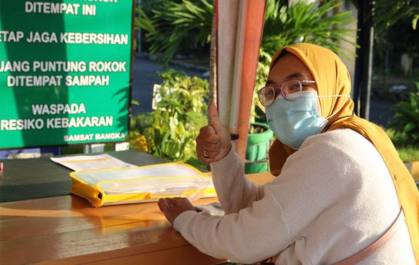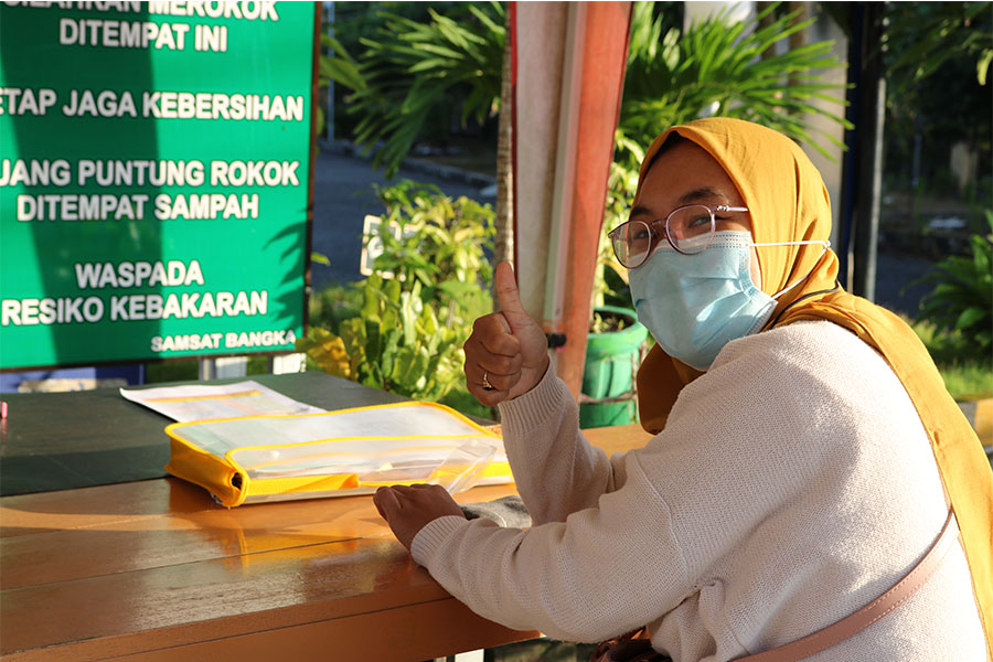 Vera...Pegawai Klinik Bersalin Annisa yang terletak di Jalan H.O.S Cokroaminoto Sungailiat Bangka merasa terkesan dengan Kegiatan Pelayanan Pembayaran Pajak Kendaraan Bermotor Roda 2 & Roda 4 Khusus Pengesahan Ulang 1 Tahun, Samsat Setempoh Di Loket Tambahan Samsat Bangka. Perlu diketahui masyarakat Babel, Samsat Setempoh Di Loket Tambahan Samsat Bangka di hadirkan oleh Kepala UPT.Bakuda Provinsi Kepulauan Bangka Belitung Wilayah Kabupaten Bangka, Yeri, S,Sos sebagai bentuk antisipasi untuk mengurai kepadatan/keramaian masyarakat untuk membayar pajak kendaraan bermotor di loket utama kantor Samsat Bangka. Pandemi Covid-19 menjadi momok yang menakutkan bagi seluruh manusia di muka bumi ini menjadi alasan mengapa Samsat Setempoh Di Loket Tambahan Samsat Bangka muncul melayani masyarakat dengan konsep simple dengan mengkedepankan pelayanan kepada masyarakat cepat, mudah dan selesai di tempat. Acungan jempol hera tentunya menjadi stimulus sekaligus imun bagi pegawai Samsat Bangka dalam melayani masyarakat bersama dukungan mentari pagi yang menyinari kantor Samsat Bangka. Kegiatan Samsat Setempoh Di Loket Tambahan Samsat Bangka, Jum'at, 28 Mei 2021.#PATUHSAMSATBANGKA