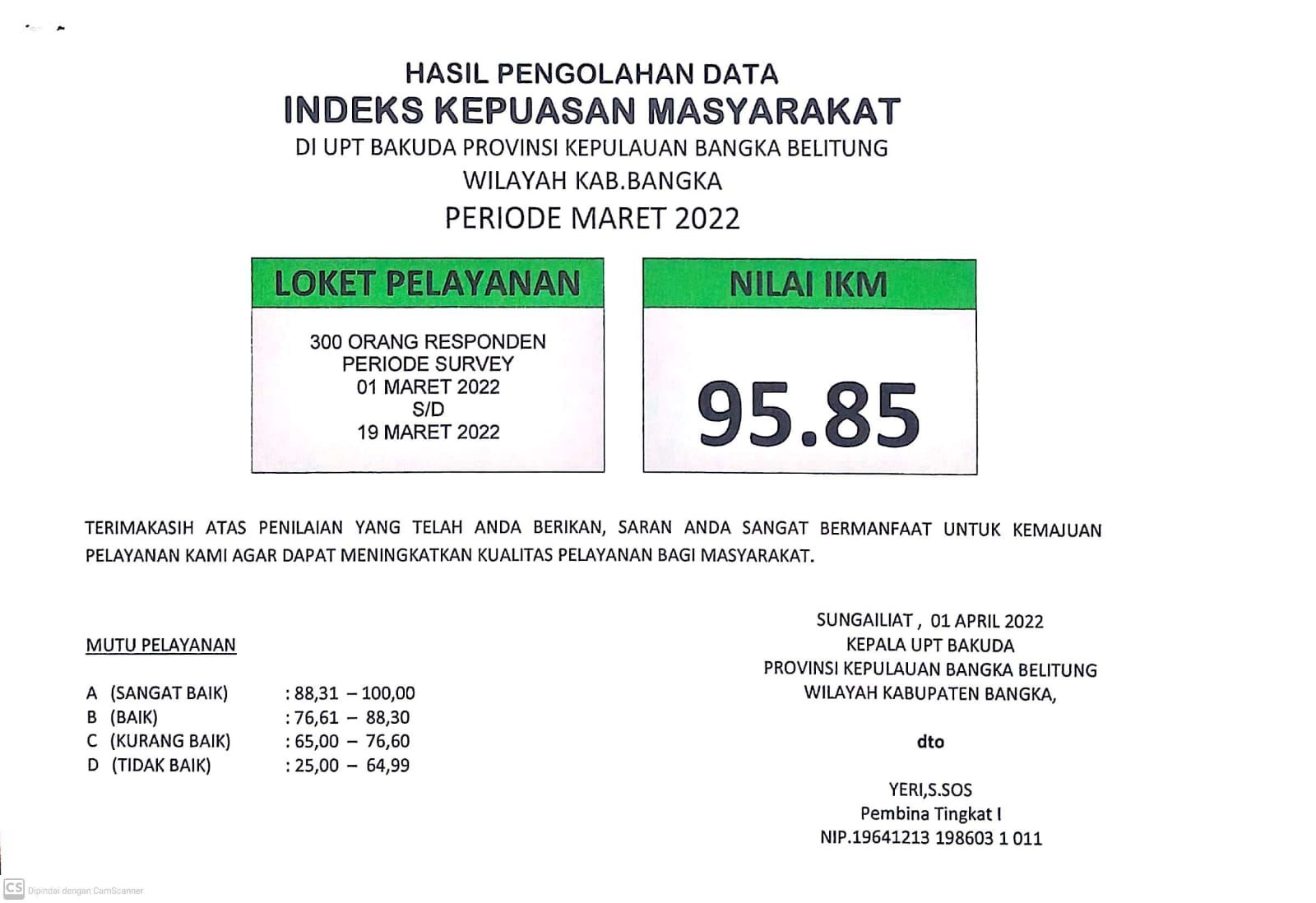 Indeks Kepuasan Masyarakat (IKM) UPT.Bakuda Provinsi Kepulauan Bangka Belitung Wilayah Kabupaten Bangka Periode Maret 2022