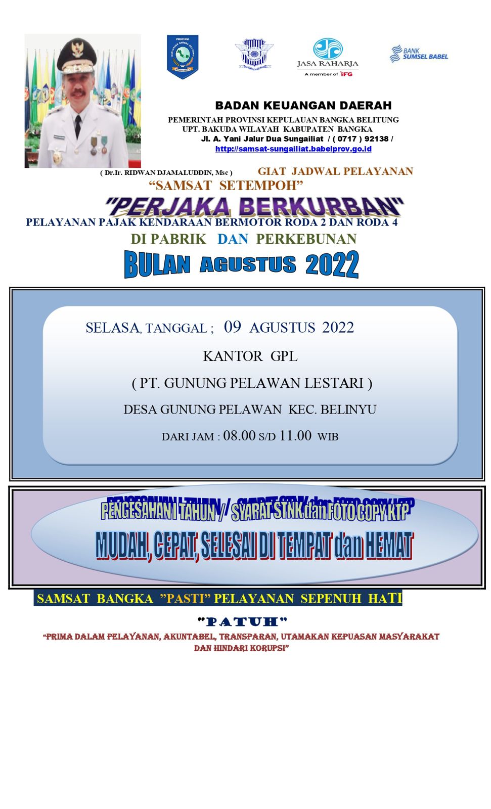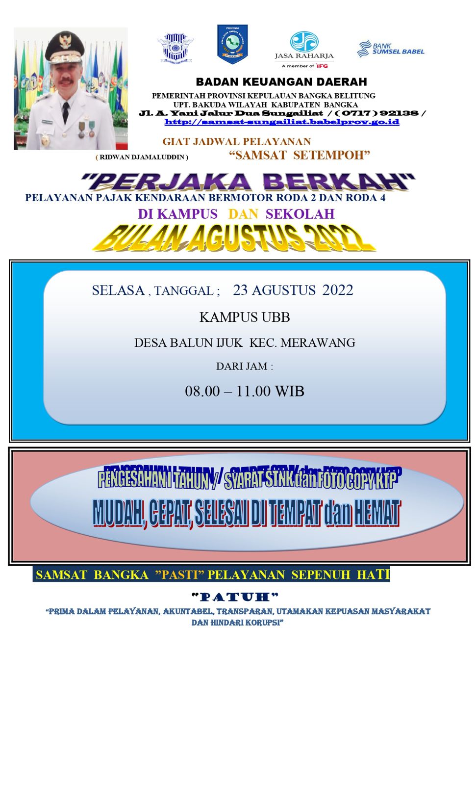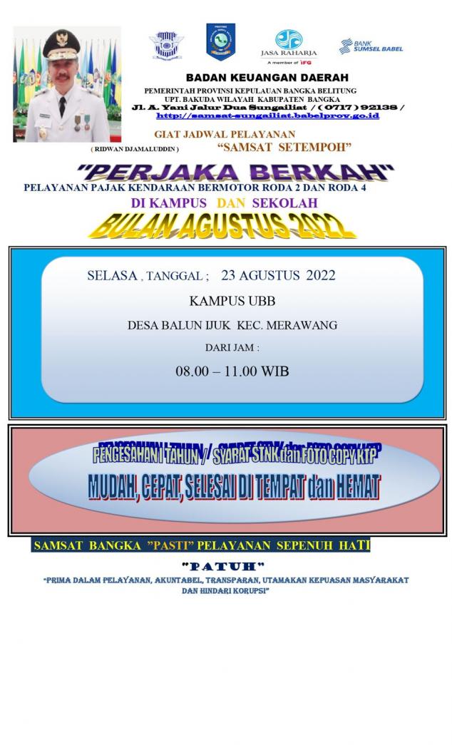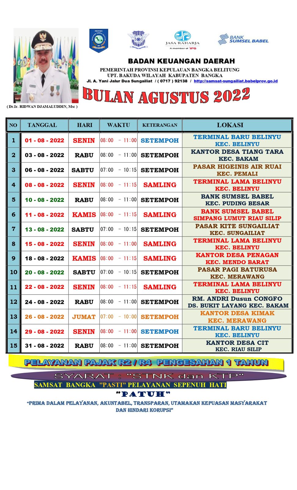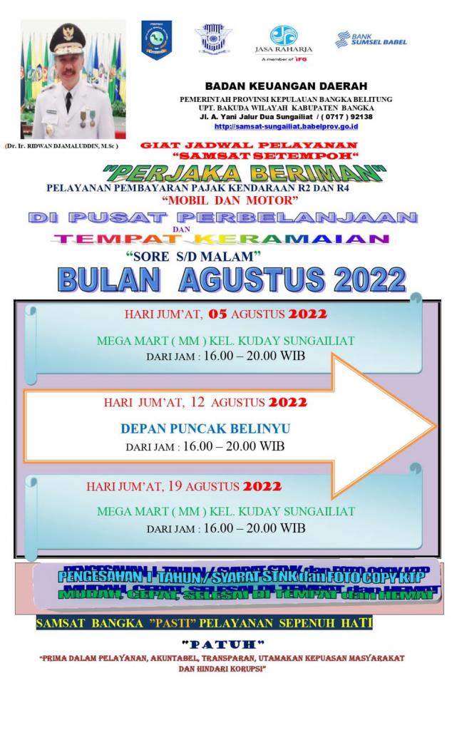 Jadwal Samling, Samsat Setempoh, Perjaka Beriman, Perjaka Berkah & Perjaka Berkurban Bulan Agustus 2022.#PATUHSAMSATBANGKA