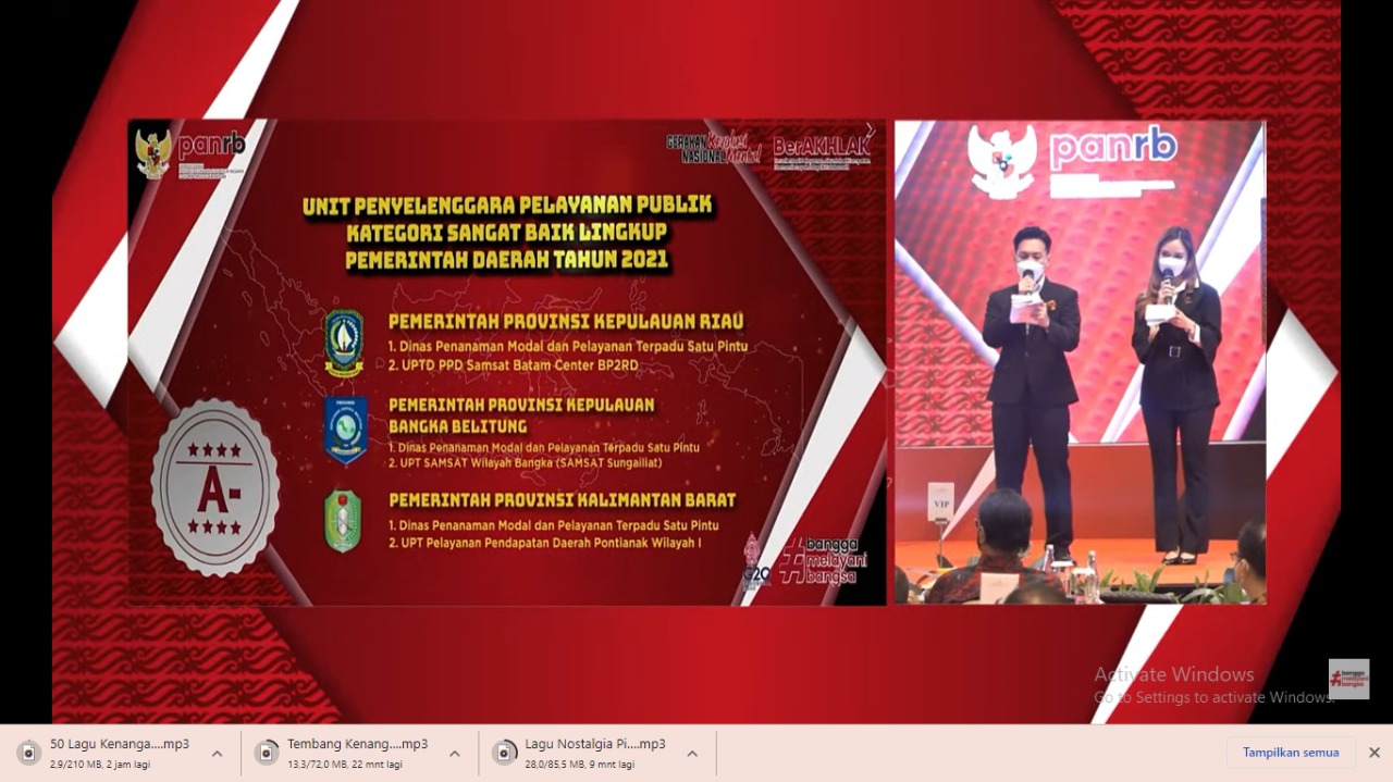 “Alhamdulillah, Samsat Bangka masih dipercaya oleh Kementerian Pendayagunaan Aparatur Negara & Reformasi sebagai Penyelenggara Pelayanan Publik Kategori Sangat Baik pada Tahun 2021 dengan Nilai A-.”Pak Yeri mengatakan bahwa kepercayaan yang diberikan oleh KEMENPANRB merupakan bukti usaha dan kerja keras kita dalam menjalankan amanat Undang-Undang Nomor 25 Tahun 2009 Tentang Pelayanan Publik.”Mudah-mudahan kita tidak berpuas diri dengan predikat ini tapi terus berjuang untuk menggapai harapan kita mendapatkan Nilai A.”#PATUHSAMSATBANGKA