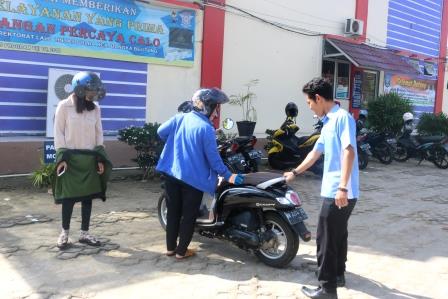Pelayanan Publik Di Samsat Sungailiat, Pegawai Samsat Sungailiat Mengeluarkan Kendaraan Roda 2 Milik Masyarakat Yang Telah Selesai Membayar Pajak Di Bagian Parkir Khusus Wanita Samsat Sungailiat, Rabu, 20 November 2019