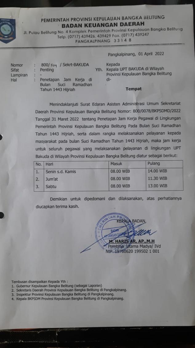 Penetapan Jam Kerja UPT.Bakuda Provinsi Kepulauan Bangka Belitung Wilayah Kabupaten Bangka Di Bulan Suci Ramadhan Tahun 1443 H.#PATUHSAMSATBANGKA