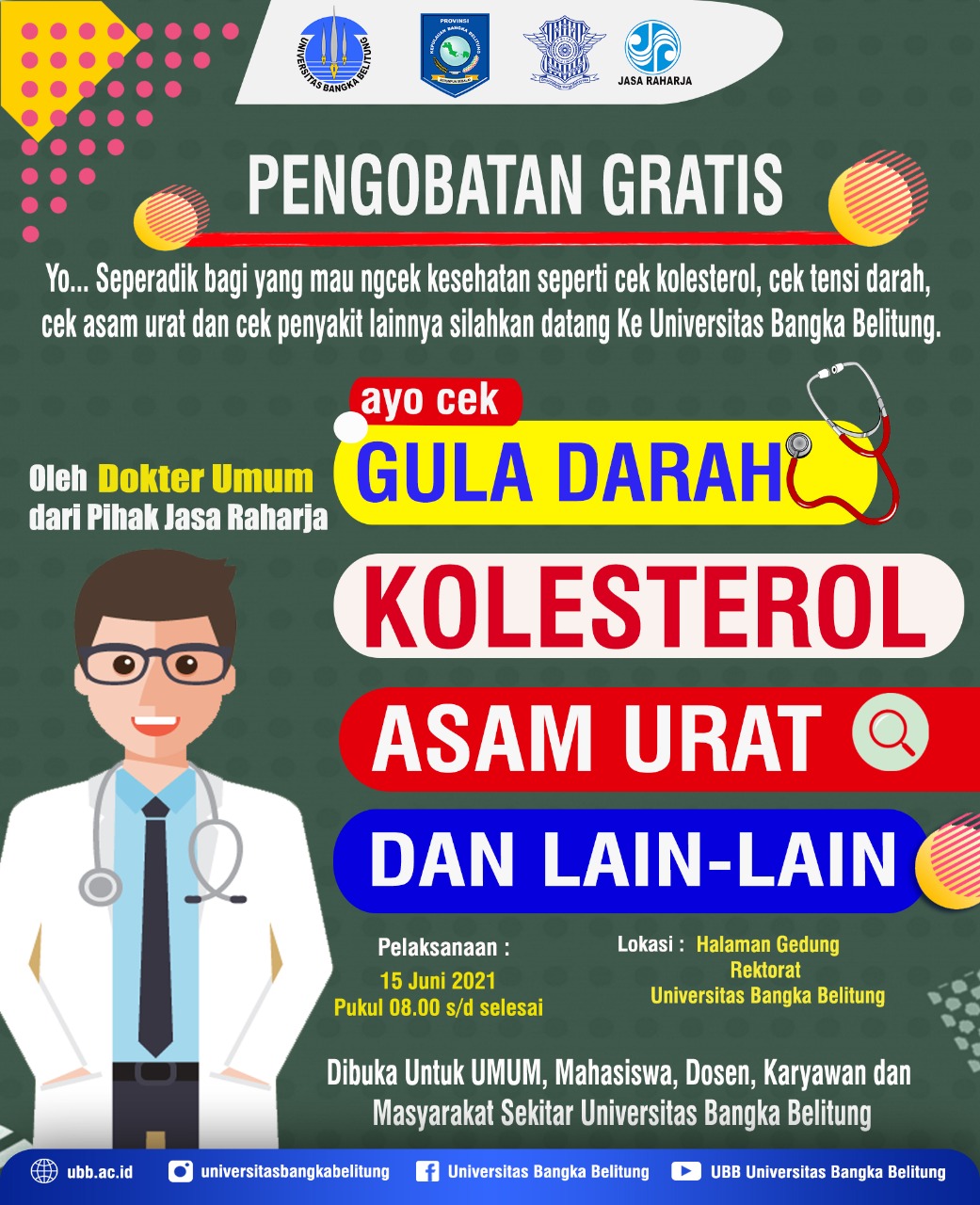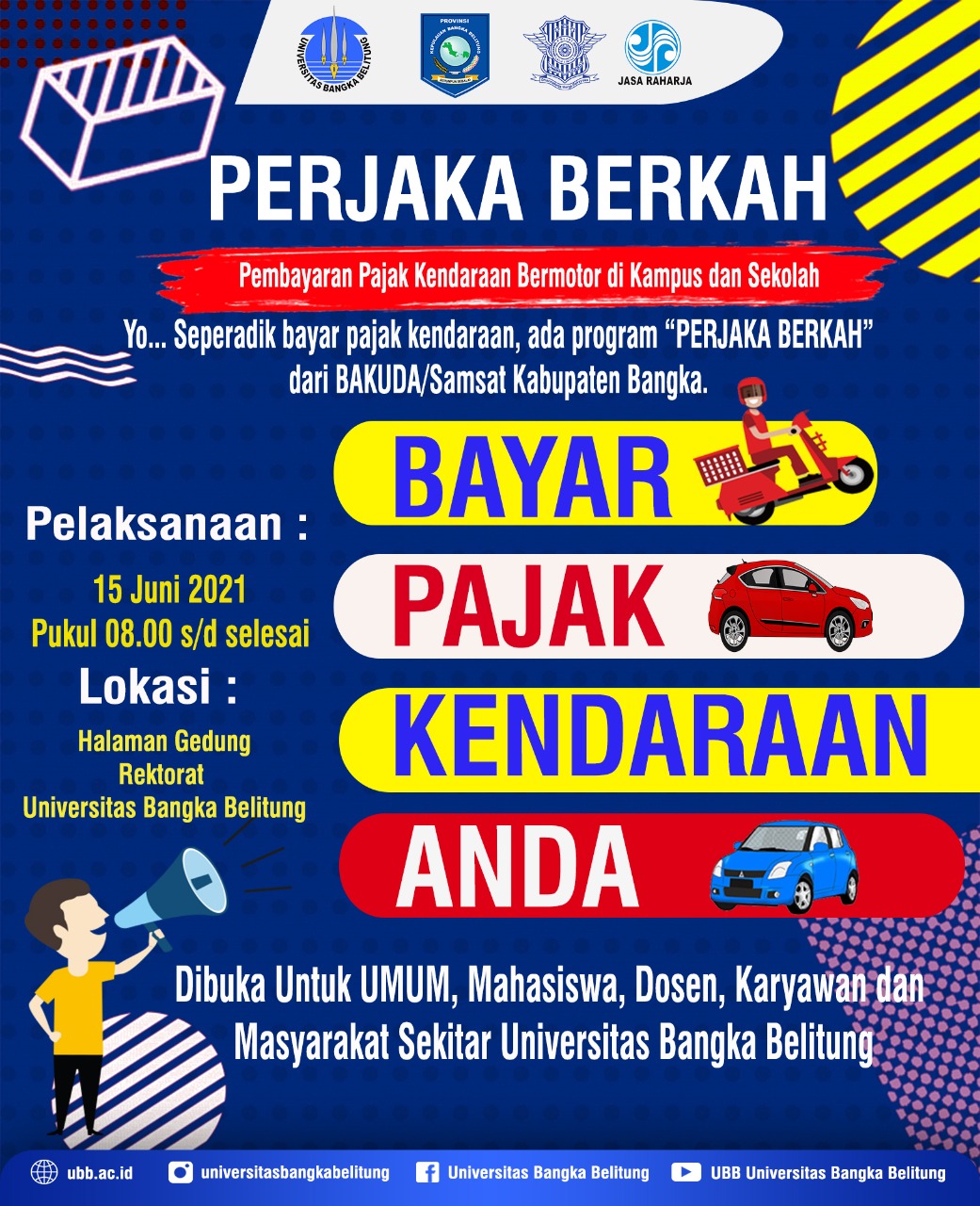 Kegiatan PERJAKA BERKAH tidak hanya untuk mahasiswa saja tetapidi buka juga untuk masyarakat umum yang akan membayar pajak kendaraaan bermotor roda 2 dan roda 4 khusus pengesahan ulang 1 tahun dengan persyaratan membawa STNK dan foto copy ktp atau ktp asli sesuai dengan data yang tertera di STNK. Selain kegiatan PERJAKA BERKA Samsat Bangka yang akan dilaksanakan di Kampus UBB, PT.Jasa Raharja Babel juga akan menghadirkan pengobatan gratis dalam kegiatan tersebut. Mahasiswa maupun Dosen serta masyarakat dapat mengecek tekanan darah, kadar gula maupun kolesterol . Kepala UPT.Bakuda Provinsi Kepulauan Bangka Belitung Wilayah Kabupaten Bangka berharap sinergitas antara UPT.Bakuda Provinsi Kepulauan Bangka Belitung Wilayah Kabupaten Bangka dan Kampus UBB dalam pelaksanaan PERJAKA BERKA Samsat Bangka akan memberikan kemudahan dalam membayar pajak dan terciptanya generasi muda yang taat pajak.#PATUHSAMSATBANGKA