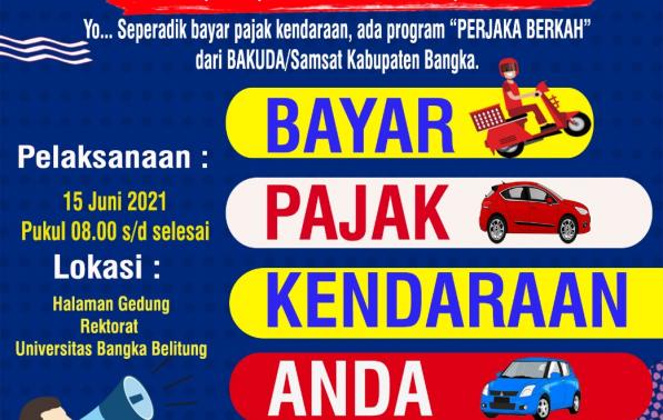 UPT.Bakuda Provinsi Kepulauan Bangka Belitung Wilayah Kabupaten Bangka/Samsat Bangka, Selasa, 15 Juni 2021 akan melaksanakan kegiatan Perdana PERJAKA BERKAH (Pelayanan Pembayaran Pajak Kendaraan Bermotor roda 2 dan roda 4 di Kampus dan Sekolah) khusus pengesahan ulang 1 tahun di Universitas Bangka Belitung (UBB). "PERJAKA BERKAH Samsat Bangka merupakan hasil inovasi dalam menggali potensi PAD yang ada di wilayah Kabupaten Bangka Provinsi Kepulauan Bangka."kata Kepala UPT.Bakuda Provinsi Kepulauan Bangka Belitung Wilayah Kabupaten Bangka, Yeri,S,Sos. Selain itu ditambahkan Pak Yeri bahawa PERJAKA BERKAH ini diharapkan dapat mengubah mindset anak-anak muda agar peduli untuk membayar pajak.