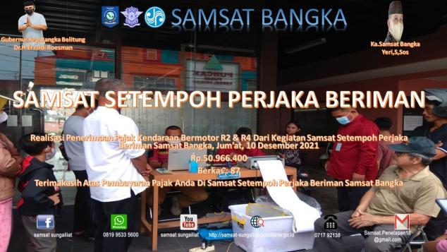 Realisasi Penerimaan Pajak Kendaraan Bermotor R2 & R4 Dari Kegiatan Samsat Setempoh Perjaka Beriman Samsat Bangka, Jum'at, 10 Desember 2021