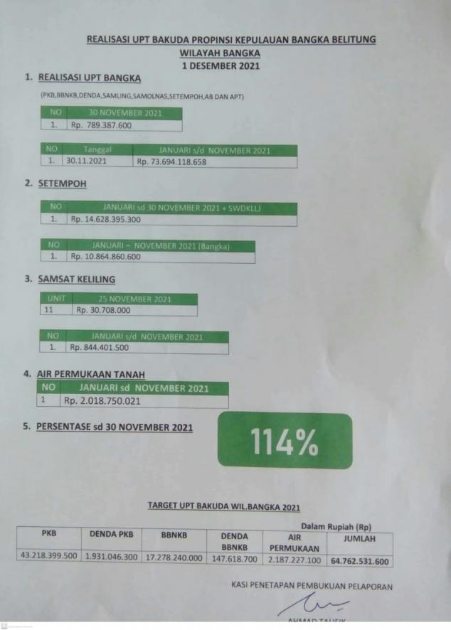 Realisasi UPT.Bakuda Provinsi Kepulauan Bangka Belitung Wilayah Kabupaten Bangka Per 1 Desember 2021.