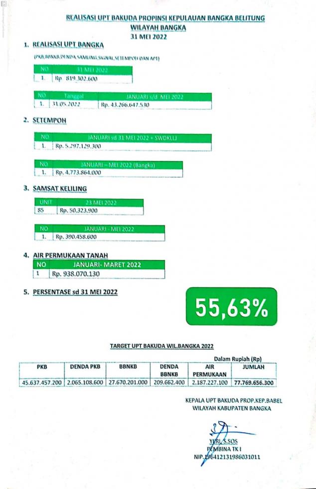 Realisasi UPT.Bakuda Provinsi Kepulauan Bangka Belitung Wilayah Kabupaten Bangka Periode Bulan Mei 2022.#PATUHSAMSATBANGKA