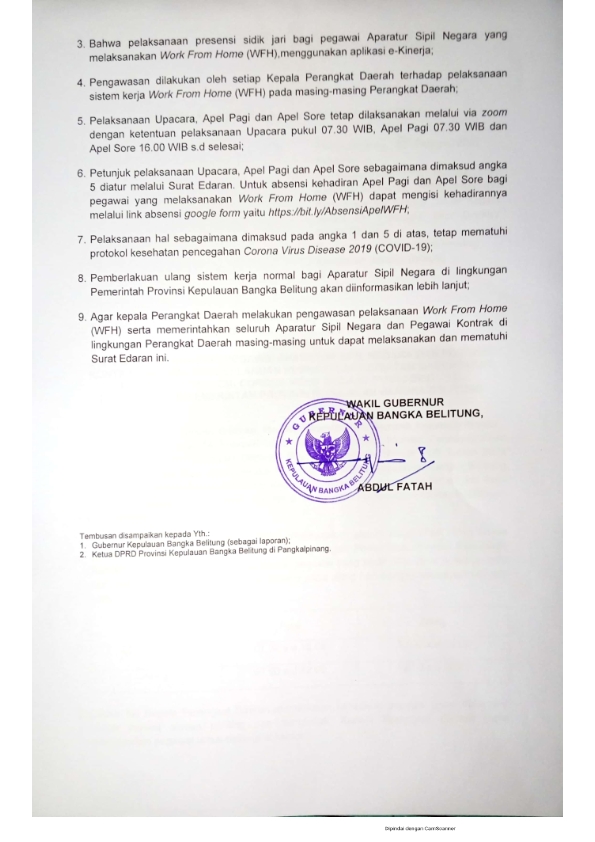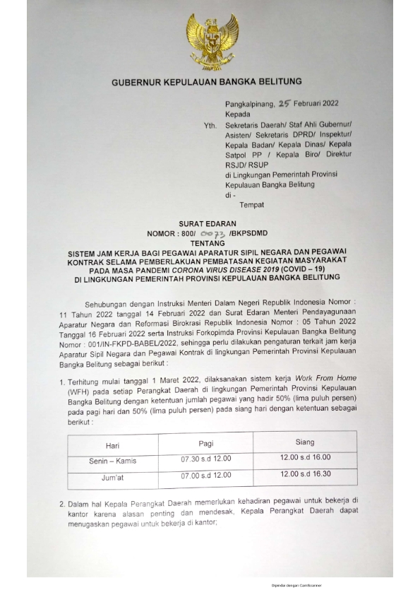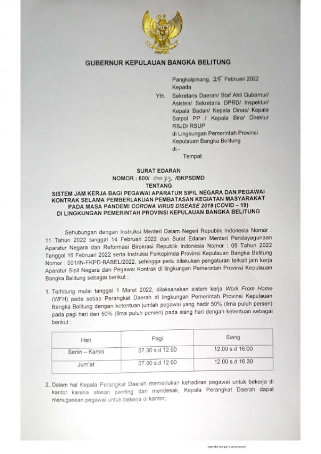 Surat Edaran Gubernur Kepulauan Bangka Belitung Nomor : 800/0073/BKPSDMD Tentang SISTEM JAM KERJA BAGI PEGAWAI APARATUR SIPIL NEGARA DAN PEGAWAI KONTRAK SELAMA PEMBERLAKUAN PEMBATASAN KEGIATAN MASYARAKAT PADA MASA PANDEMI CORONA VIRUS DISEASE (COVID-19) D