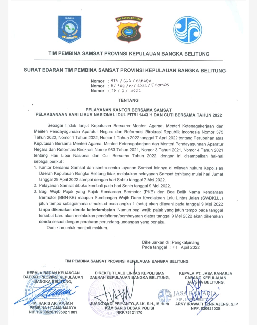 Surat Edaran Tim Pembina Samsat Provinsi Kepulauan Bangka Belitung Nomor : 973/636/BAKUDA, Nomor : 309/IV/2022/DITLANTAS, Nomor : SP/3/2022 Tentang Pelayanan Kantor Samsat, Pelaksanaan Hari Libur Nasional Idul Fitri 1443 H Dan Cuti Bersama Tahun 2022.#PAT